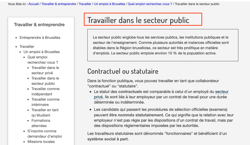 Tout comme les contractuels et les indépendants, le fonctionnaire statutaire travaille pour un employeur : les autorités. Il peut s’agir d’autorités locales, régionales ou fédérales. Vous trouverez la page suivante sur le site bruxellois :