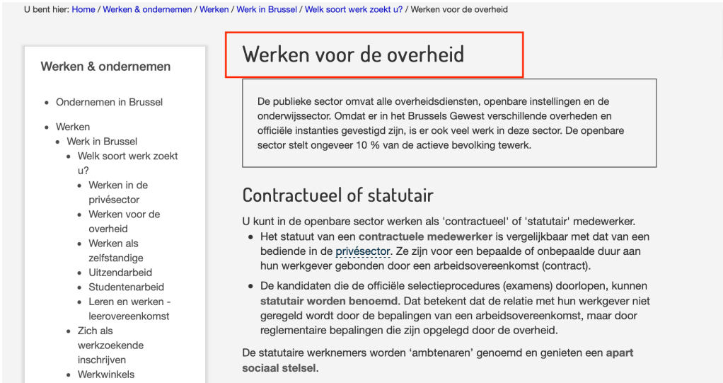 Net zoals de contractueel en de zelfstandige werkt de statutaire ambtenaar voor een werkgever : de overheid. Dit kan een lokale overheid zijn, een regionale of een federale overheid. Op de website van Brussel vind je de volgende pagina : https://be.brussels/werken-en-ondernemen/werken/werk-in-brussel/welk-soort-werk-zoekt-u/werken-voor-de-overheid?set_language=nl