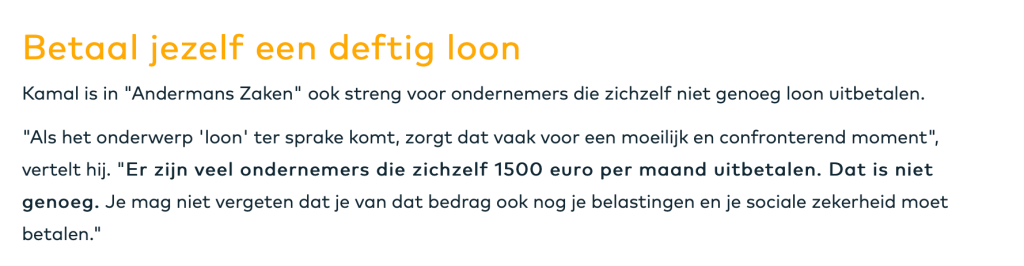 Hetzelfde idee van de zelfstandige als werknemer en werkgever zien we terugkomen in de boeiende reeks “Andermans zaken” van Kamal Kharmach. Je kan meer lezen op https://radio2.be/de-inspecteur/kamal-kharmach-de-vlaamse-ondernemer-werkt-graag-in-zijn-zaak-maar-niet-aan-zijn-zaak