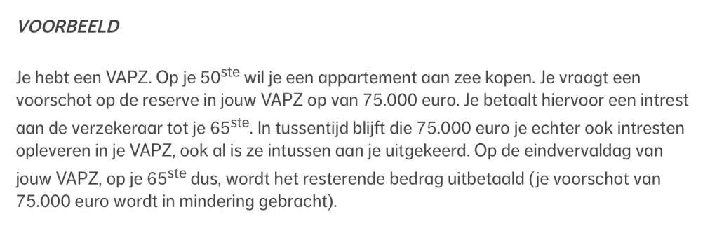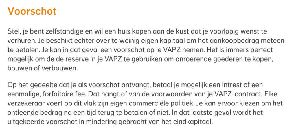 De website voegt er nog een voorbeeld aan toe. Via de VAPZ kan een zelfstandige dus een deel van het pensioen opnemen nog voor de feitelijke pensioendatum. Sterker nog, ook al is het geld al opgenomen voor de aankoop van immobiliën, dan nog levert dit geld intrest op.